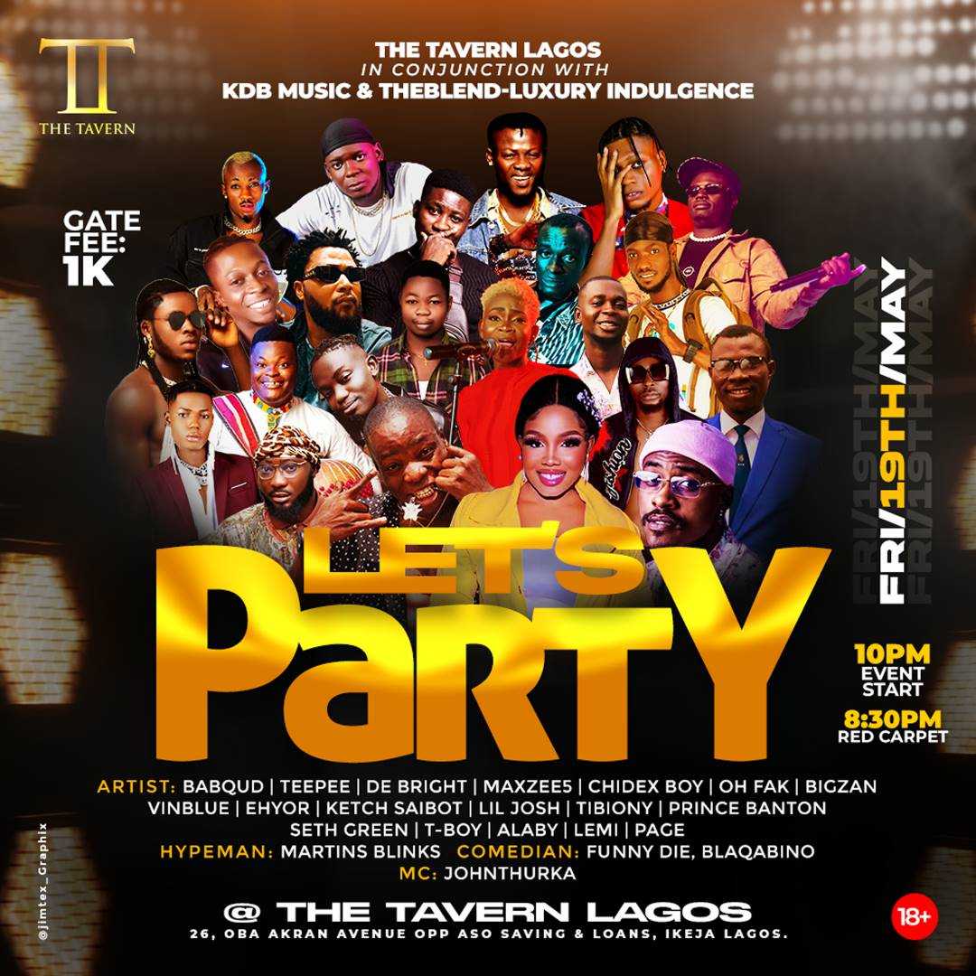 THE TAVERN LAGOS In conjunction with KDB MUSIC & THE BLEND-LUXURY INDULGENCE brings you this Biggest Hottest party that is about to go down,I don’t want you to miss this Party called LET’S PARTY it all about meeting new faces,Connecting with new friends and having Fun,If you are the type that love having fun,Connecting with new people trust me this Party is for you,Just come around with your friends and loved ones,So many Artist will be perfoming on that day and comedians for you to vibe along,TRUST me it just gonna be fun..
