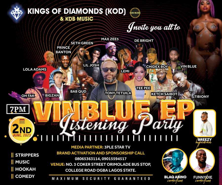 Finally What you all have been waiting for is about to drop,KINGS OF DIAMONDS(KOD)&KDBMUSIC invite you all to VINBLUE listening Party,You all need to come out and have fun this very day come listen to the full music on the EP and watch VINBLUE performing all music on his EP live ,I promise you all it gonna be boom,So many different artist and comedians will be around to make you happy,Just bring all your family and friends loved ones to celebrate with VINBLUE,It gonna be the best out of the best,Trust me guys,Come Party and Have fun!